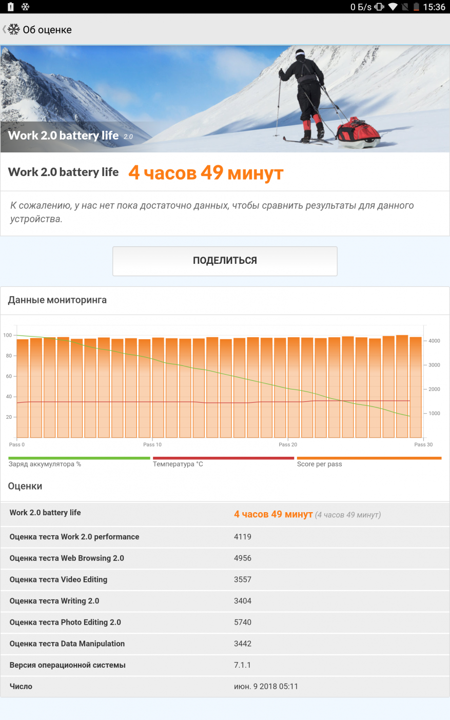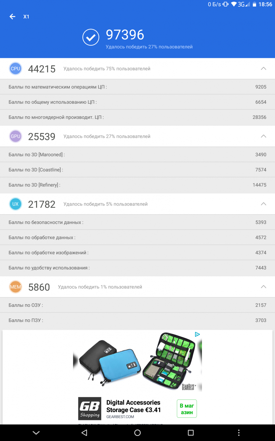 В Antutu планшет набирает 97396 баллов, показывая высокий результат в процессорной части и более скромный в графике. В GeekBench 4 все также довольно пристойно, режим одного ядра — 1597 баллов, многоядерный режим — 4833 балла. Результаты дают понять, что планшет имеет достаточную производительность для нормальной работы в качестве развлекательного мультимедийного устройства.